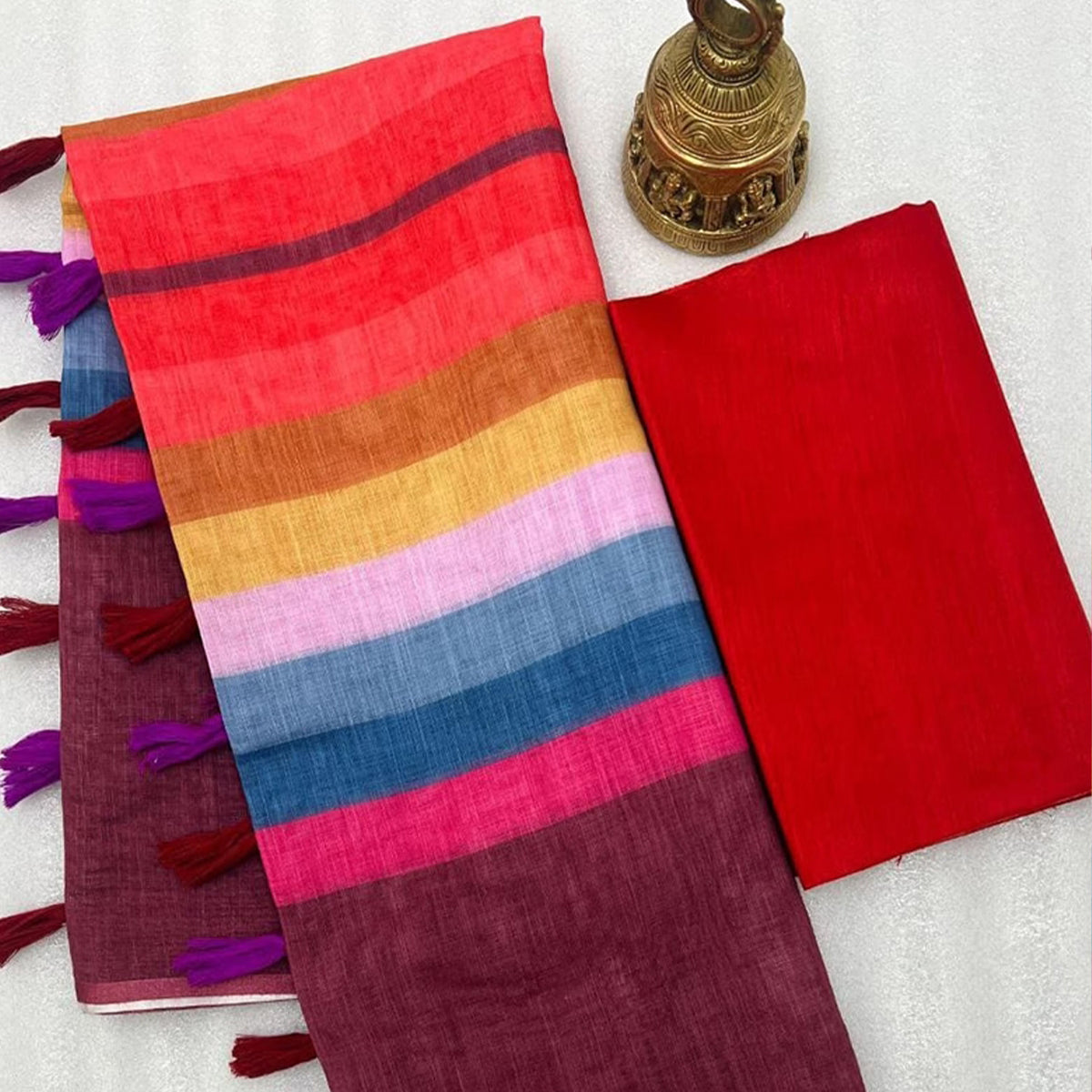 Brown Rainbow Stripe Linen Cotton Saree