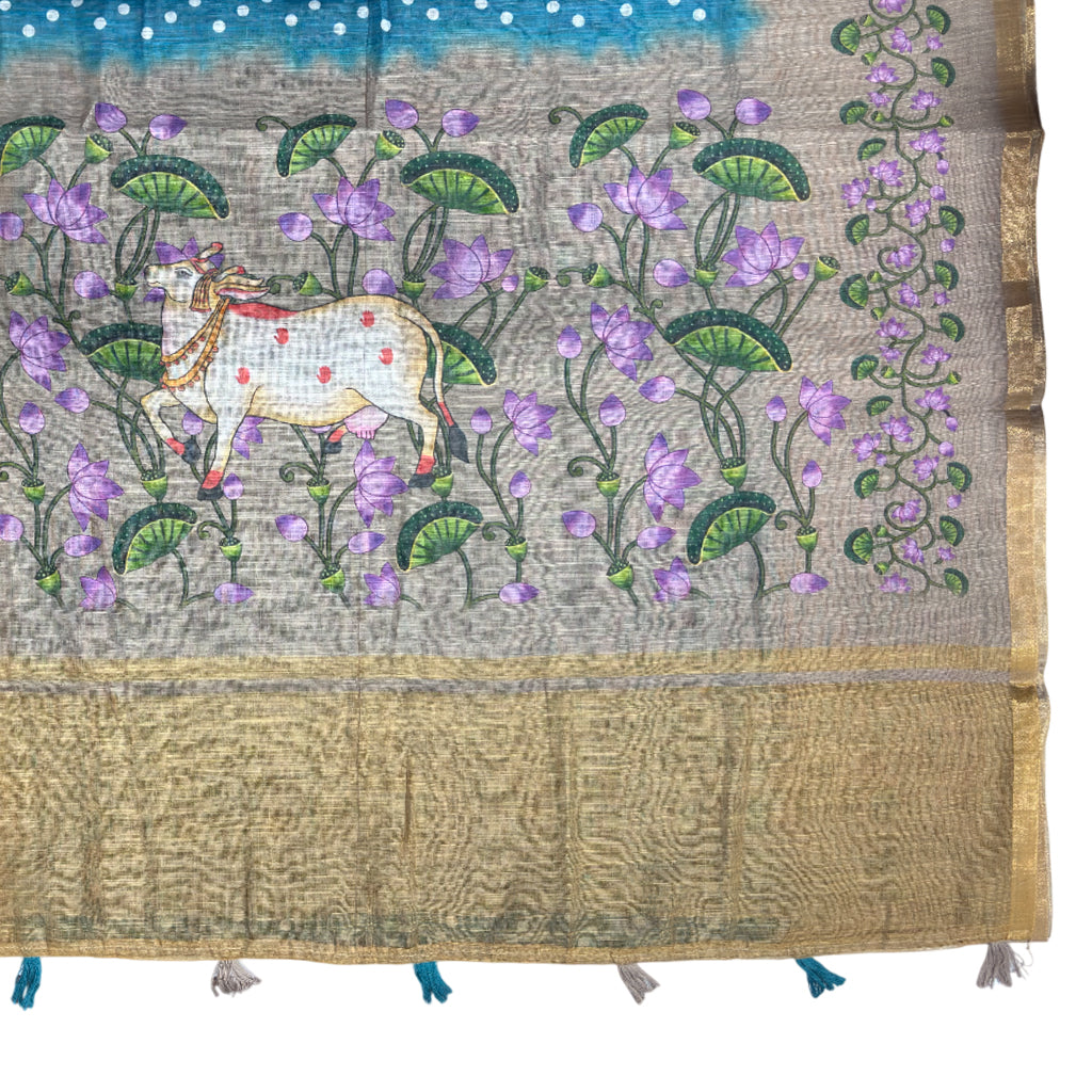 Teal Blue Beige Pichwai Printed Cotton Linen Sar
