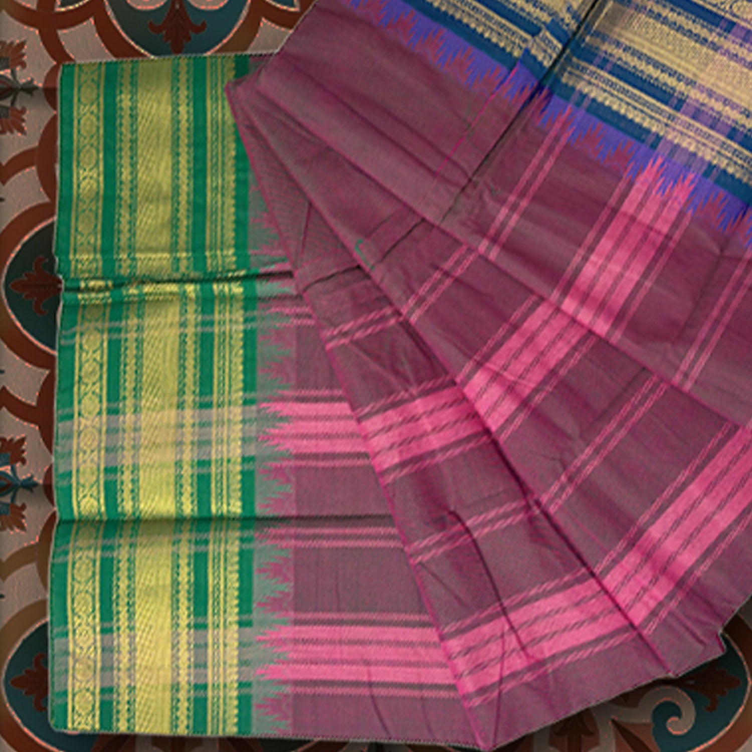Drape yourself in the effortless grace of this Twilight Prism Chettinad Cotton Saree, featuring a deep navy blue body crafted from soft, breathable cotton. This unique design showcases a mesmerizing pallu woven with bold, contrasting rainbow checks (including shades of pink, yellow, and turquoise). The lightweight comfort and vibrant aesthetic make this piece ideal for casual wear, office settings, or cheerful cultural events.