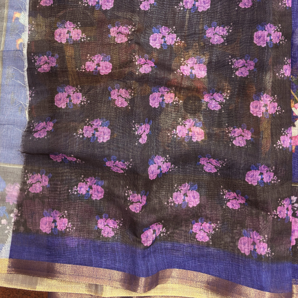 Command attention with this vibrant Royal Blue cotton linen saree. The border comes alive with a majestic procession of decorated elephants and royal attendants carrying flags, set against a rich blue canvas. Offset by a unique border of purple roses on a black band, it is the perfect fusion of royal heritage and bold floral design